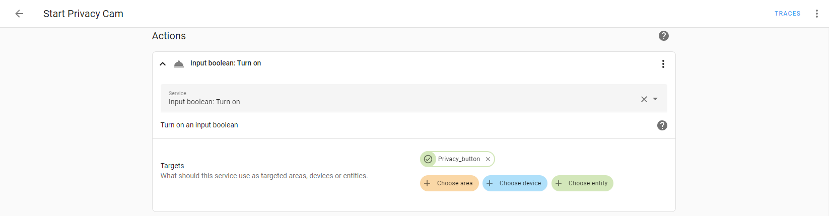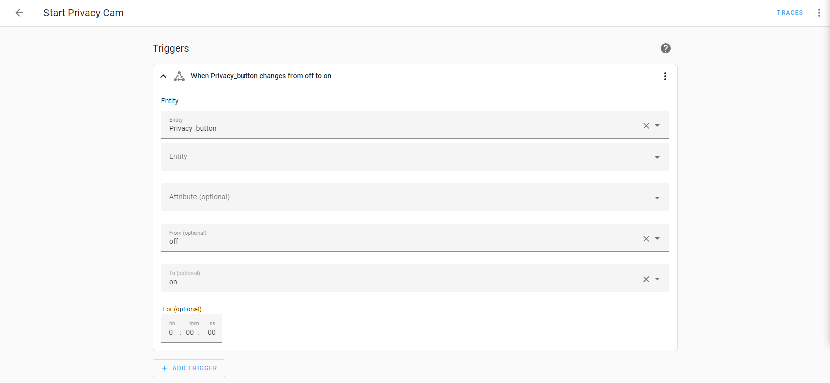 We will name this button Start Privacy Cam and fill in the “Triggers” section, selecting the previously created button and specifying from “off” to “on”, because we are turning on the privacy mode.